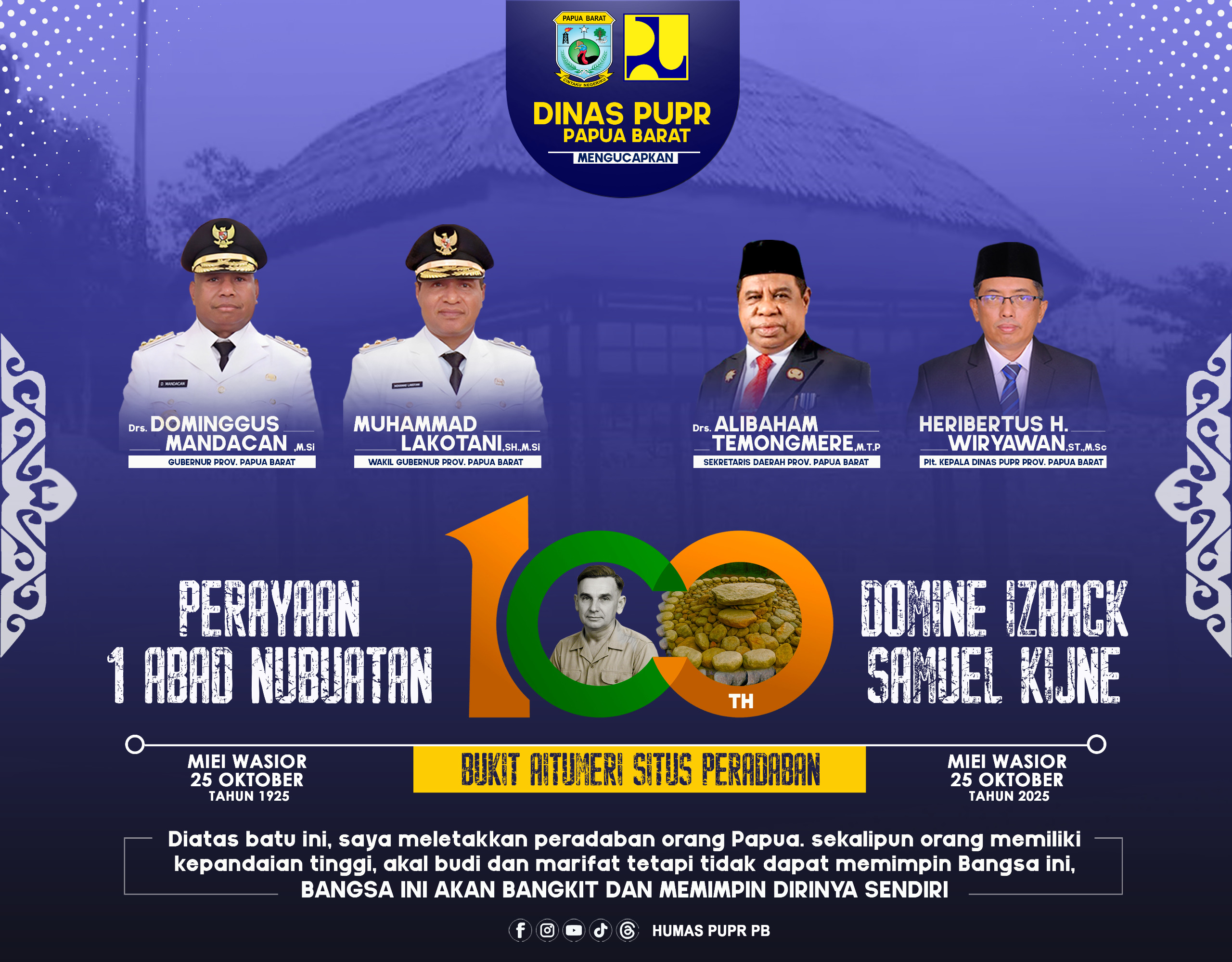 Manokwari, 24 Oktober 2025 — Dinas Pekerjaan Umum dan Perumahan Rakyat Provinsi Papua Barat (Dinas PUPR PB) melalui Pelaksana Tugas (Plt.) Kepala Dinas, Ir. Heribertus H. Wiryawan, ST., M.Sc, menyampaikan ucapan selamat atas peringatan 1 Abad Nubuatan dari Misionaris Domine Izaack Samuel Kijne, yang dipusatkan di Bukit Aitumeri, Miei, Kabupaten Teluk Wondama.